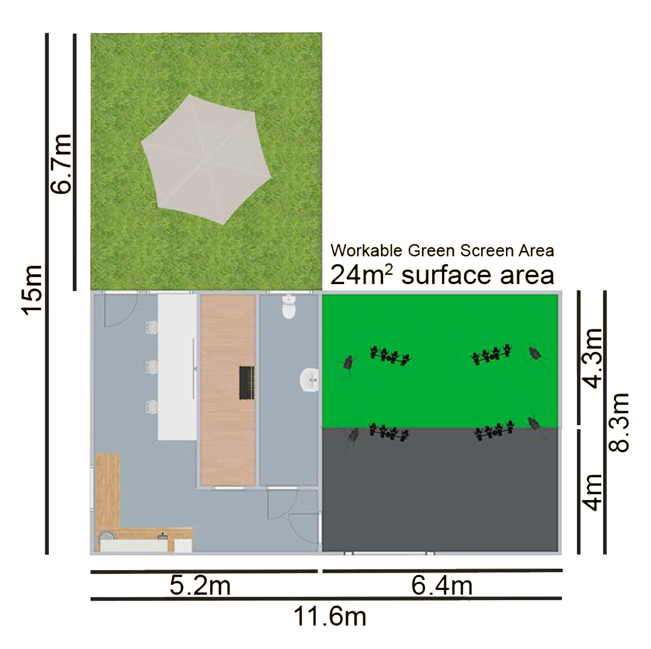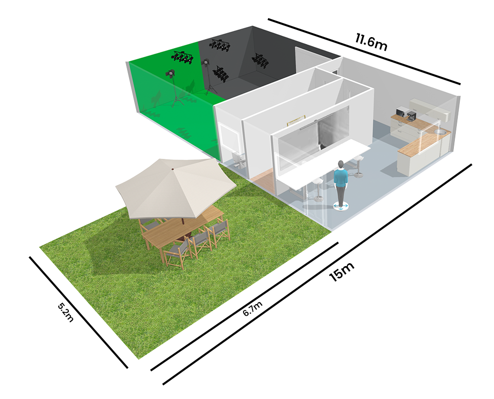 Our studio is equipped with SWIT LED panel truss lighting to ensure even spread of lighting, essential for chromakey in post-production. Our studio facilities include a make-up room, control room, loading bays, inside parking, outside entertainment area, kitchenette, changing rooms, wi-fi, and the option to enjoy catering options. Groups under 10 pax will enjoy coffee and water on the house.